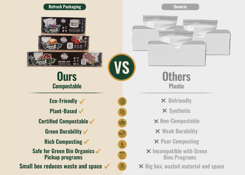 Unlike other brands, Refresh Packaging’s certified Compostable Zip Top Bags carry the Seedling certification, which means they are safe for home composting. These compostable Zip Top food storage bags break down perfectly in compost facilities across Canada with no toxic residue left behind and meet the ASTM D6400 standard, which means they break down in less than 84 days.