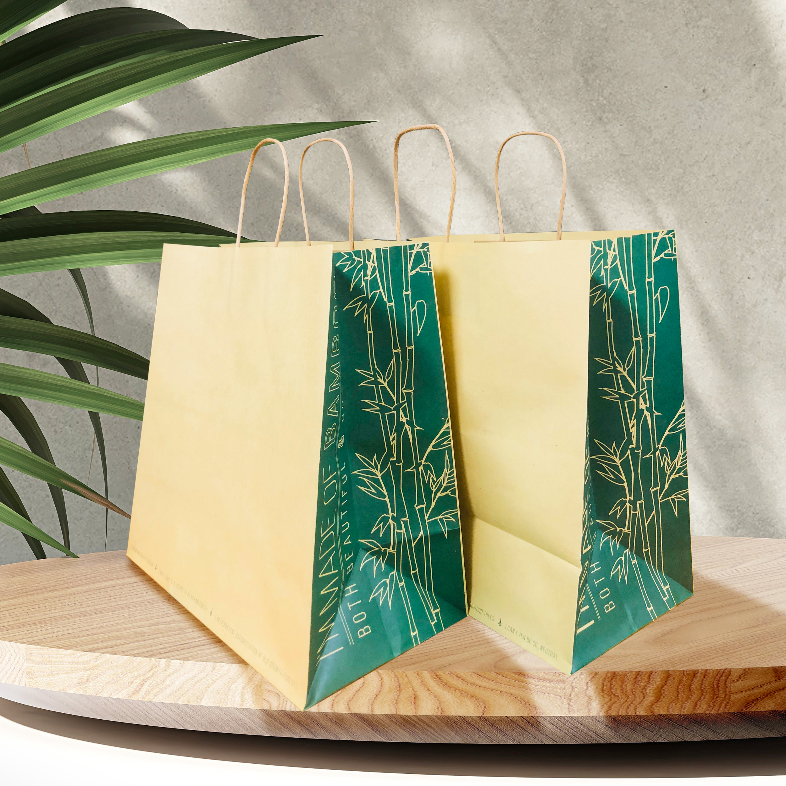 Our Large 13x7x13" rope handled paper bags are safe for all composting facilities and programs in Canada, the United States and Europe. Our paper bags are an excellent choice given the single-use plastic ban that the Federal Government of Canada has announced. Strength and ease of use for the customer is always a concern with paper bags, but with out bamboo bags they have a strong handle that can handle the weight of up to 20lbs. Bamboo paper has stronger fibres which makes them a much higher quality solution for your store. With bamboo as our preferred paper source, our bags are the most proven eco-friendly solution next to a certified compostable resin bags.