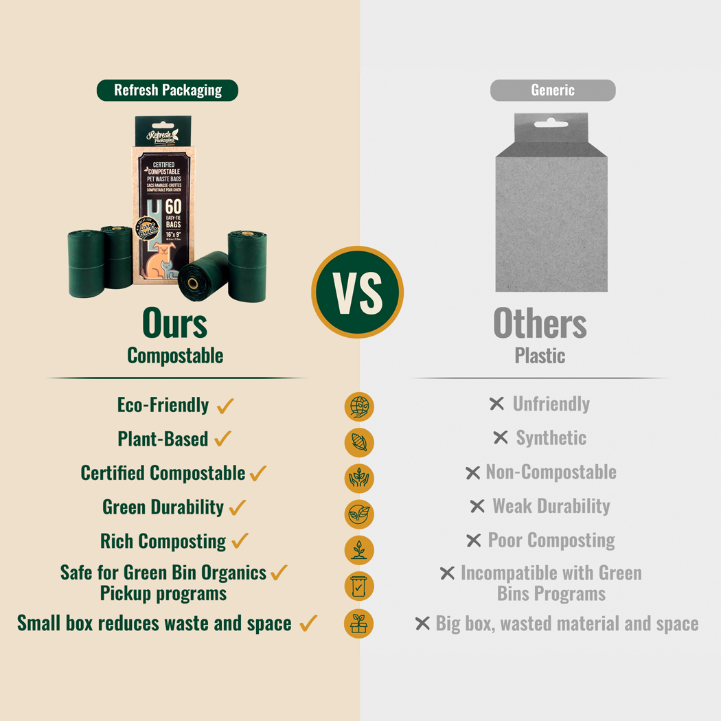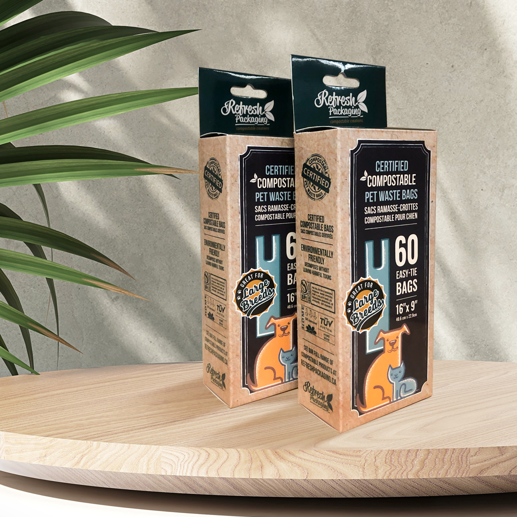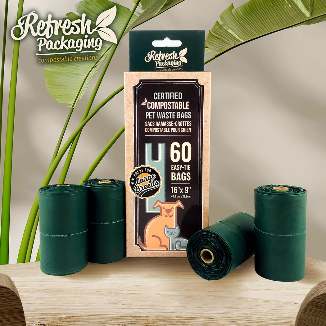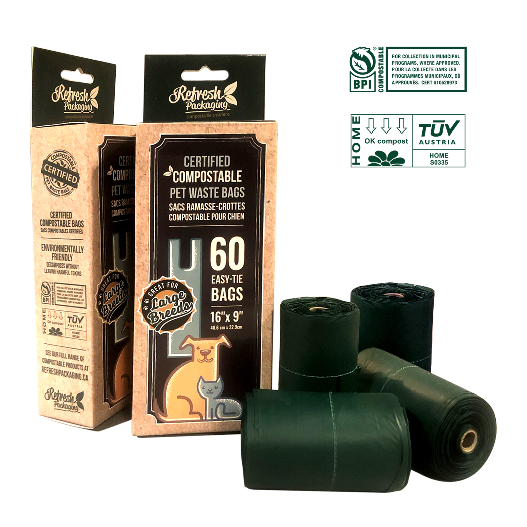 Our pet waste bags are the best on the market. We are so proud to offer such an incredible product. These bags are the perfect size for any pet, not too big, but not too small, and they come with handles. So tying the bags once they're full is easy with no mess. At Refresh we are animal lovers too. This bag was inspired by our own pet. We affectionately say they are "Duke approved" since they have passed the test with flying colours when managing our own German Shepherd's presents. As all our products, they are 100% certified compostable, and even home compostable, carrying 5 world wide certifications.